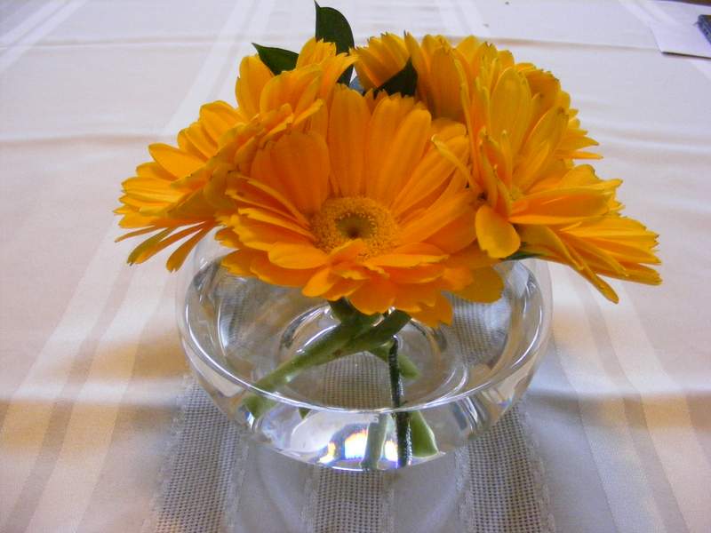 Potentially less fatal is the choice of floral vessel. Our cats love to knock over flower arrangements, so I thought I would try a different vase shape. I linked to a low, round cat-friendly vase in my last post, but I am cheap and Goodwill is closer than Ikea, so I started there. I scored a low, round Umbra bowl for $1.99 — perfect for a proof of concept before splashing out a whole $12 at rapacious Ikea. The Kev and I picked up some cat-safe Gerbera daisies, and Bob was truly our uncle.