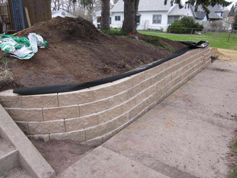Put a piece of good landscape fabric behind the wall. The landscape fabric will prevent soil from pushing through cracks between the blocks, but allow water to escape between the blocks. Use staples to hold the bottom of the landscape fabric in place.
