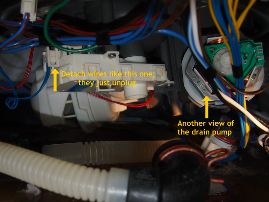 Random drain pump (from Sears Parts Direct) — whole thing is about the size of a baseball (I pointed it out a couple of places up-post; there’s a wiring harness and housing that clips around it underneath the machine)