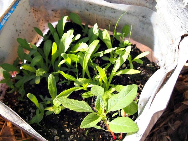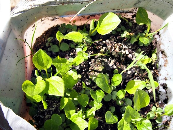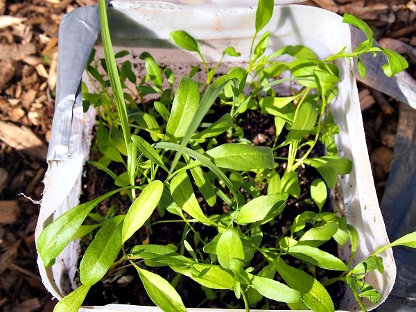 Of course, they weren’t all successes. Two are complete losses, and one jug has many seedlings, but possibly not the seedlings I started–they could all be volunteer weeds. In fact, every jug ends up with its share of weeds and grass, so wait for “real” leaves to distinguish your plants. One year, I tenderly nurtured a single seedling for a much-desired plant that turned out to be a weed.